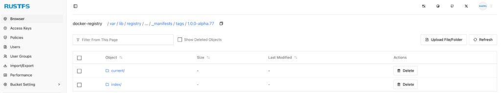 As you can see, the relevant data for the container image localhost:5000/rustfs:1.0.0-alpha.77 has been successfully stored in RustFS.